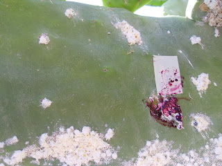 | In the picture above ,waxy substance covered cochineals.Near the white square flattened insects with their carmine color. FINCA SOFIA TEAM |